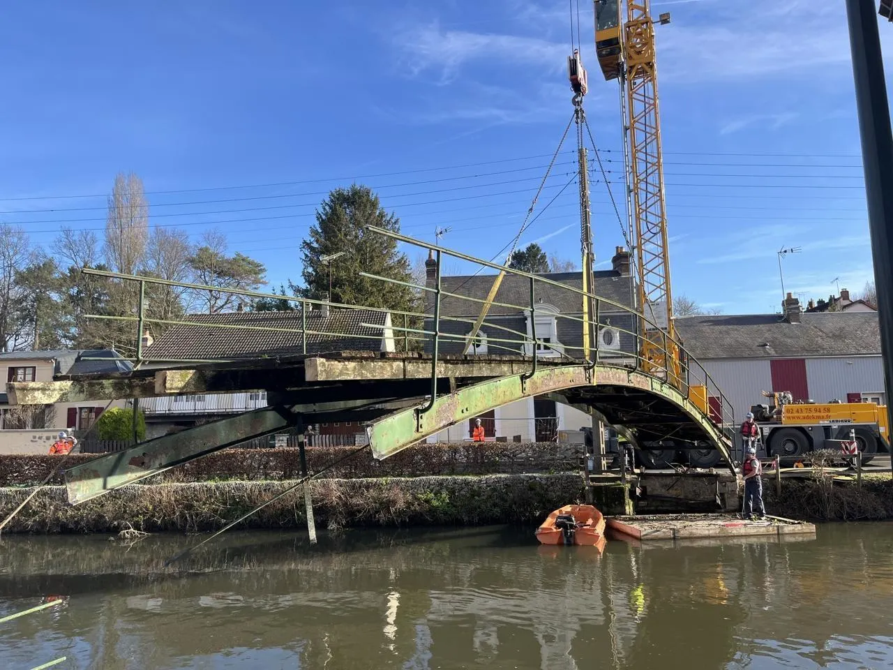 Fermée au public depuis le mois d’août 2023, la passerelle Tafforeau, située à La Ferté-Bernard (Sarthe), a été entièrement retirée ce mardi 16 décembre 2025. Une nouvelle étape dans un projet à plus de 180 000 €.