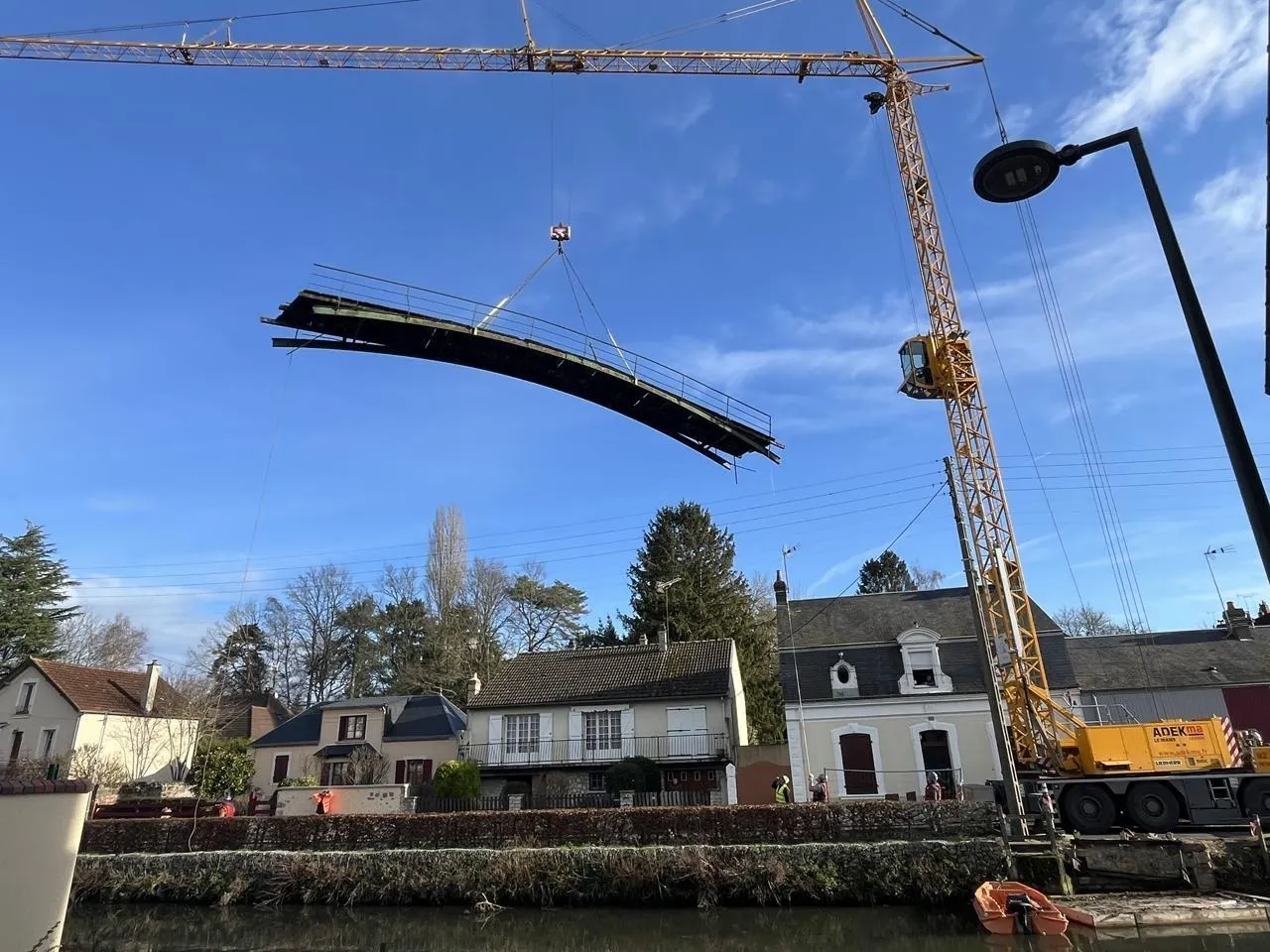 La Ferté-Bernard, 16 décembre 2025. La dépose de la passerelle Tafforeau a duré plus de trois heures dans la matinée. © Le Maine Libre