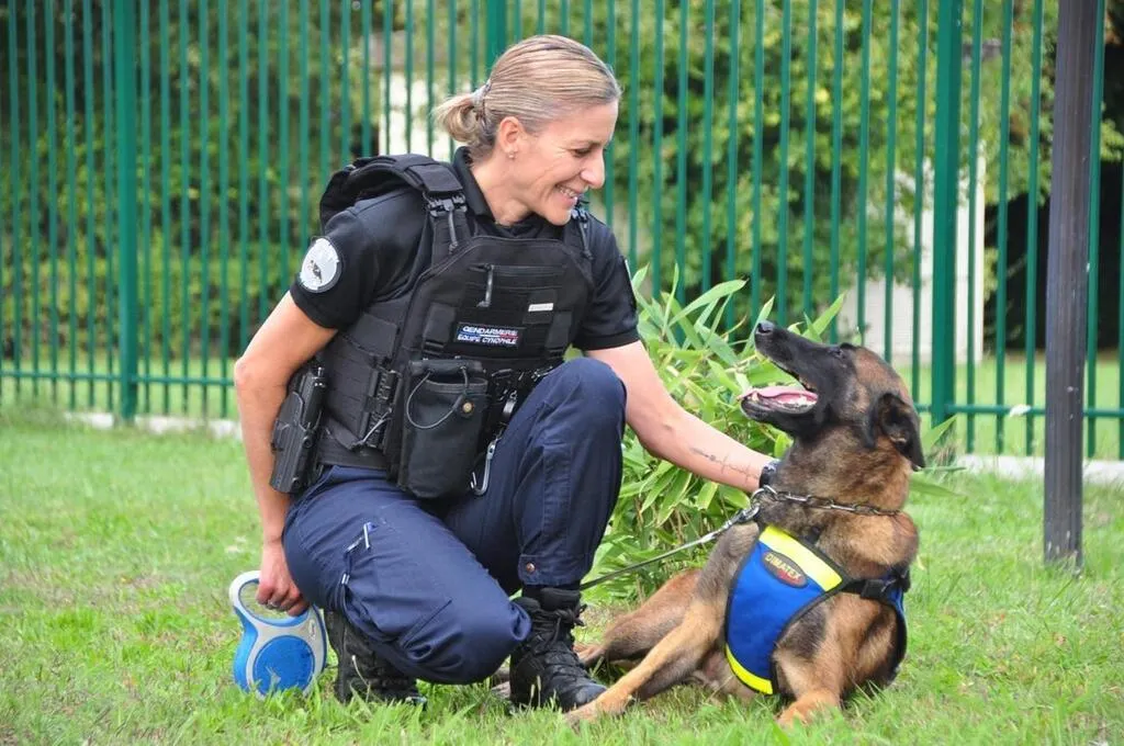 Équipe cynophile de la compagnie de gendarmerie de La Flèche, septembre 2023. Adjudant-chef Céline Besnard et Pulaar, un malinois âgé de 4 ans et demi. © Archives Le Maine Libre