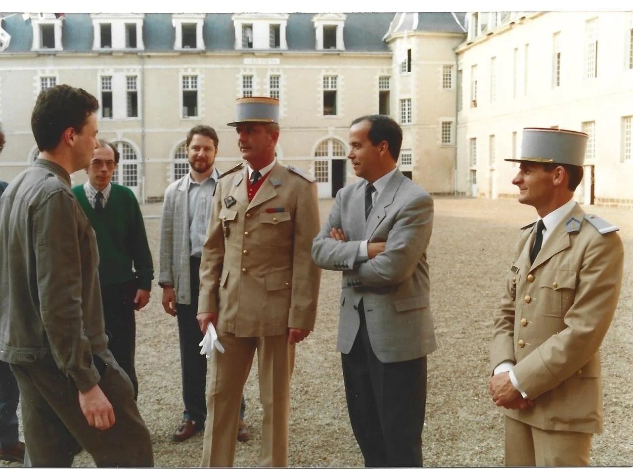 Le 18 mai 1989, le spationaute Patrick Baudry vient au Prytanée à la rencontre des élèves, ici entre le colonel Corrigou (à gauche), commandant le Prytanée, et Jean-Claude Ménard, chargé des relations publiques. © DR