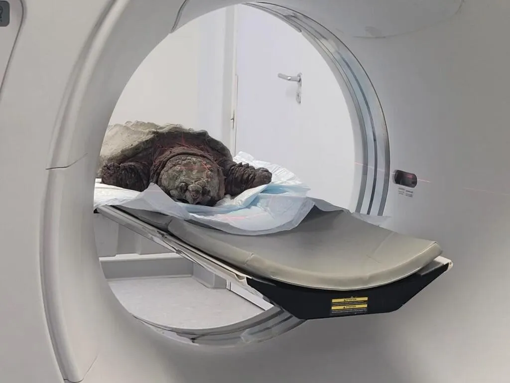 Lundi 31 mars 2025, les vétérinaires de la clinique de Pontlieue, au Mans (Sarthe), ont fait passer un scanner à Pashir, tortue-alligator de 25 ans, domicilié au parc animalier de Spay.