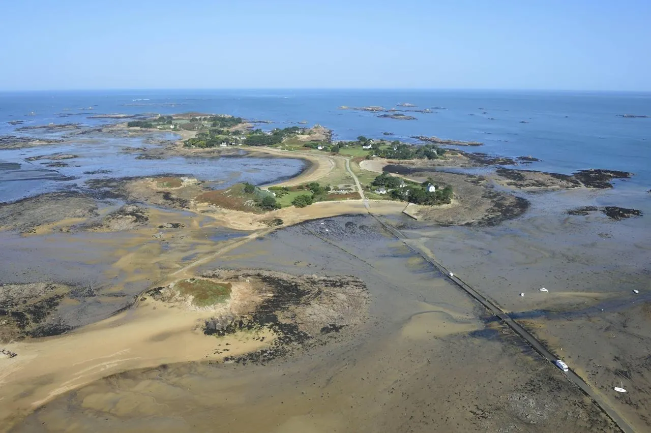 L’île Callot est accessible à pied via La Passe aux moutons. Ce jeudi 22 janvier 2026, des touristes ont été surpris par la marée montante et se sont réfugiés sur des îlots. © OUEST-FRANCE