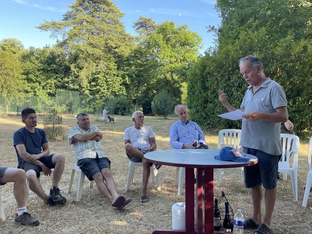 Christophe Touchet dresse le bilan des festivités du 15 juin 2025 devant une quinzaine de bénévoles, dans le parc du château de Juigné. © Le Maine Libre