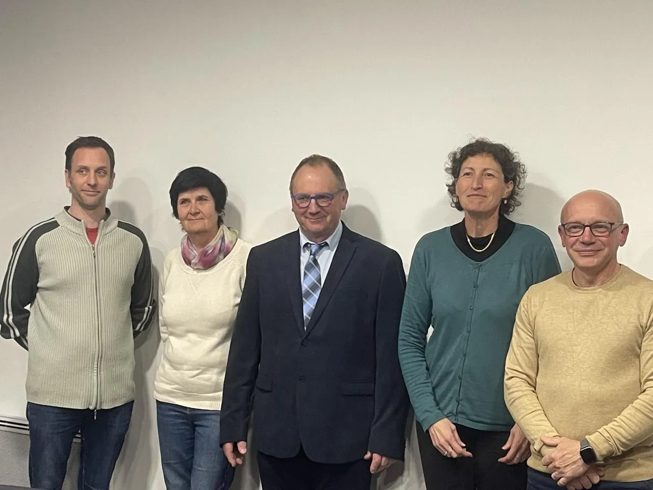 Le maire entouré de ses quatre adjoints : Nicolas Moreau, quatrième adjoint, Annick Perrichet Baudet, première adjointe, Patrice Leboucher, maire, Stéphanie Tarnaud, troisième adjointe, et Sébastien Bouvier, quatrième adjoint. © Ouest-France