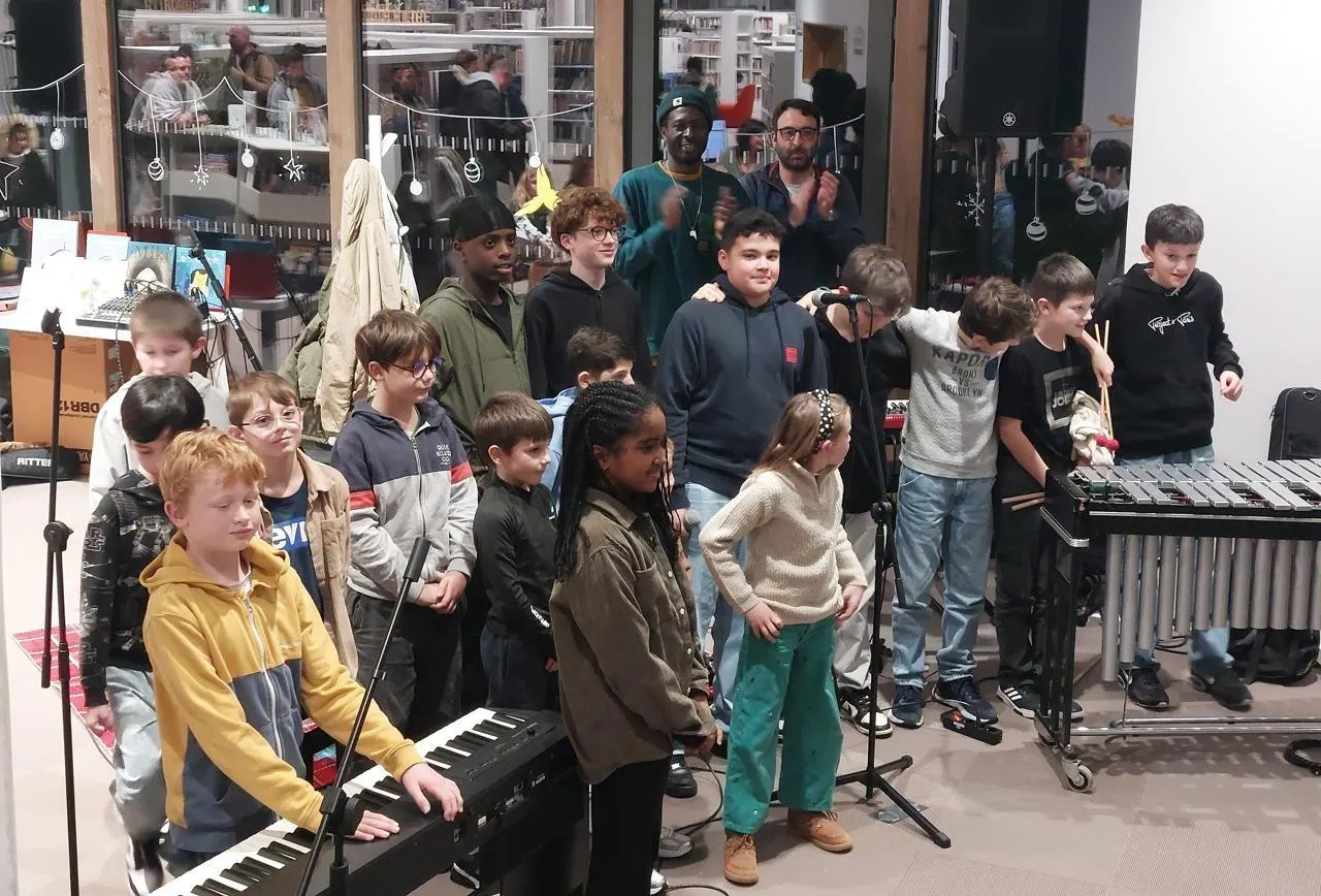 Les élèves qui sont produits, mercredi 21 janvier 2026, à la médiathèque de L’Apostrophe, dans le cadre du projet Rap’oétique, à Sablé-sur-Sarthe, autour de DJ Alla et Romain Delahaies-Lemaître (en arrière-plan). © Conservatoire Hélène-Affichard