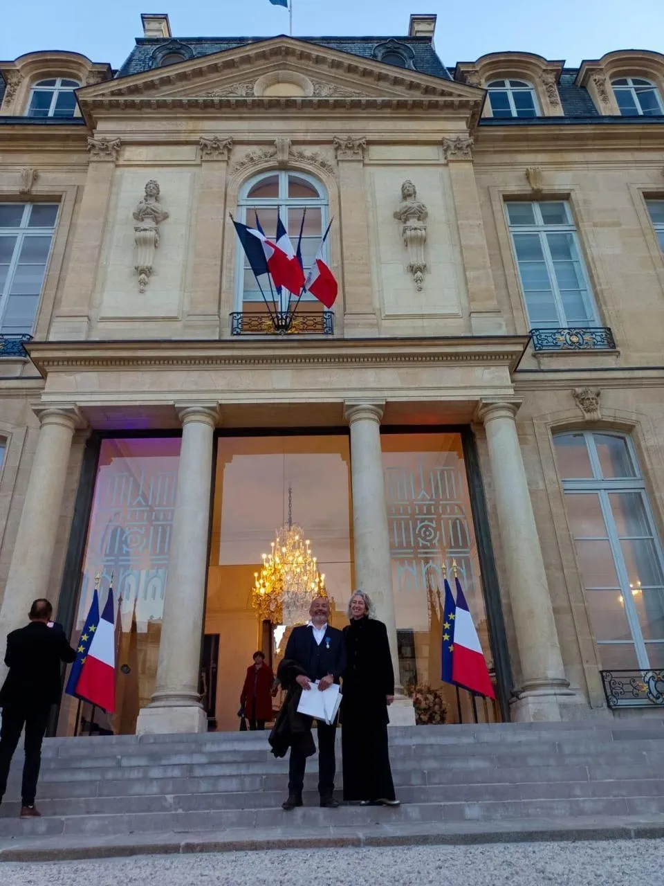 Paris, palais de l’Élysée, mardi 15 avril 2025. Les artisans et compagnons qui ont reconstruit Notre-Dame-de-Paris, dont Emmanuel Putanier pour Vitrail France, ont été reçus par Emmanuel Macron. © Le Courrier de l’Ouest
