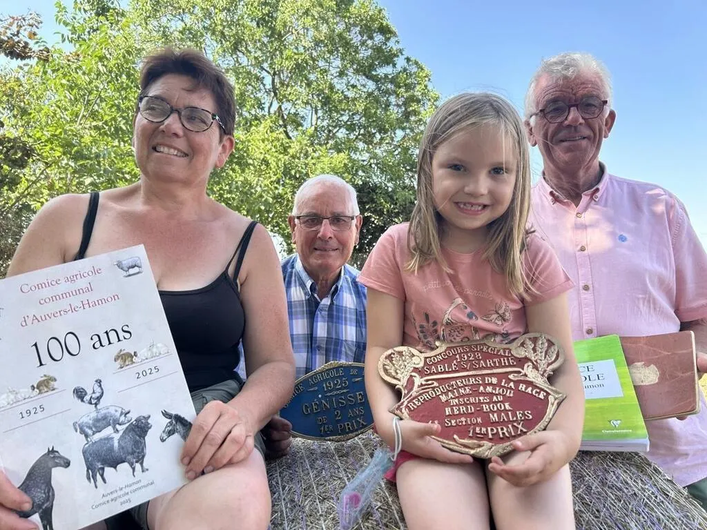 Auvers-le-Hamon, mercredi 2 juillet 2025. Nathalie David, son père Michel, sa petite-fille Ynnaya, et Jean-Claude Giteau heureux de fêter le centième anniversaire de leur comice ce samedi. © Le Maine Libre