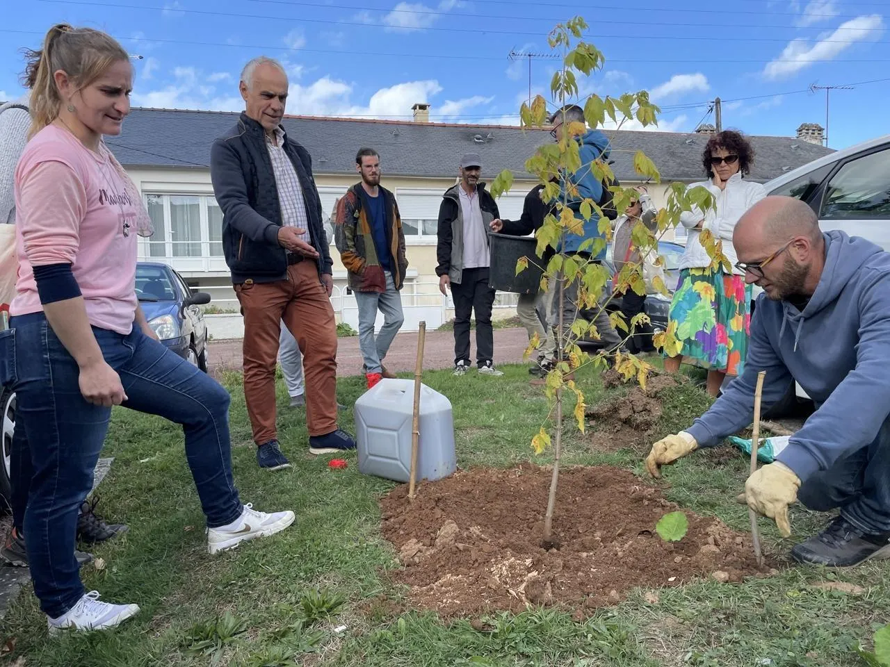Manon Provost avec Pascal Coconnier et Pierrick Massé de l’association AIME, qui dispose des roses trémières à côté du jeune platane planté place Saint-Marc. © Le Maine Libre