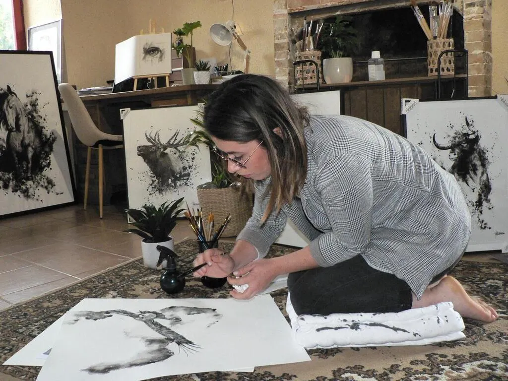 Assise par terre, ARTEM Manon peint des aquarelles en utilisant uniquement la couleur noire. © Ouest-France