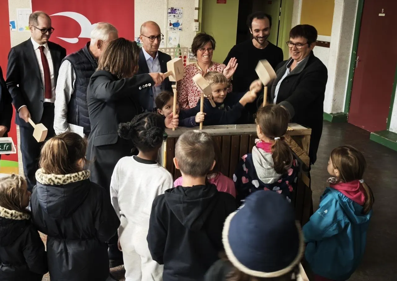 Vendredi 14 novembre 2025, après la sortie des classes, le préau de l’école Paul-Langevin, à Allonnes (Sarthe), était prêt pour la pose de la première pierre des travaux s’étaleront sur quatre ans. Le projet comprend la rénovation et l’agrandissement de l’école élémentaire, de l’école maternelle, la réhabilitation du restaurant scolaire, et les extérieurs qui seront végétalisés et aménagés en espaces de jeux, potagers et verger. Au final, le groupe scolaire fera 2 500 m², et pourra accueillir 250 enfants dans quatorze classes, où le traitement environnemental de cet ancien bâtiment datant des années 1970, devrait permettre 59 % de gain énergétique.