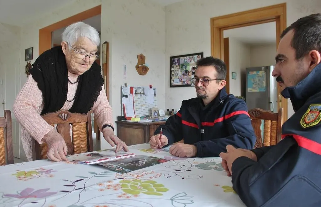 François Leffray et Jérôme Fontaine remettant un calendrier 2024 à Solange, 90 ans, habitante de Chantenay-Villedieu, le 11 novembre 2023. © Ouest-France