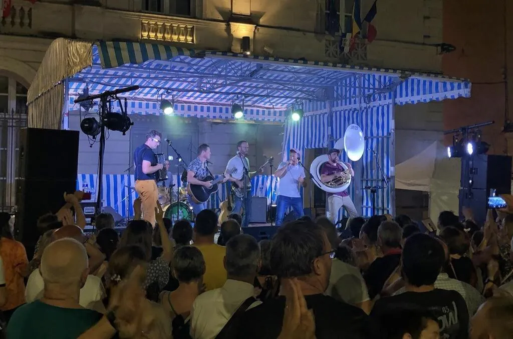 Le concert du groupe Sans Prétention a commencé vers 22 h sur la grande scène place Raphaël-Élizé, vendredi 17 juin, à Sablé-sur-Sarthe. © Ouest-France