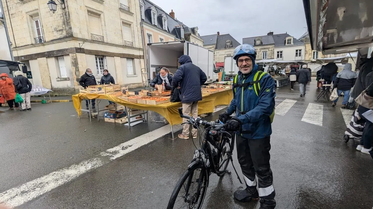 Au marché de Brissac-Quincé, le cycliste Lionel commente les liaisons cyclables entre les dix villages de la commune nouvelle. © Ouest-France