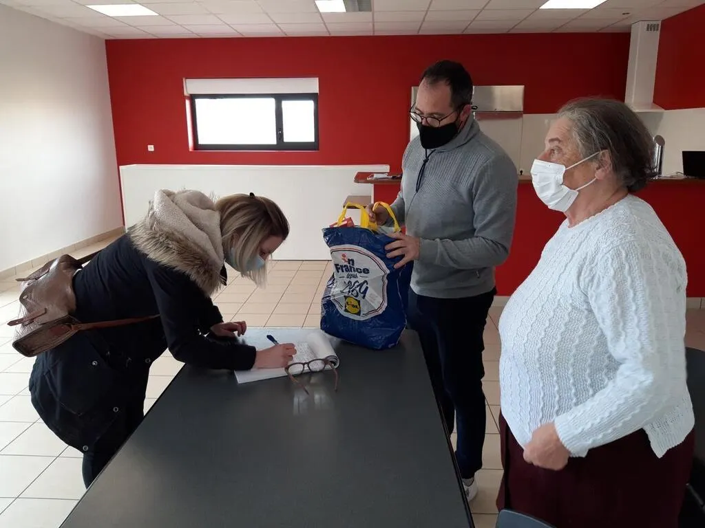 Ce mercredi 2 mars, les Sarthois sont déjà venus apporter de nombreux dons lors de la première matinée de collecte lancée par Nicolas Moignez (au centre) à Brûlon. © Photo : Ouest France