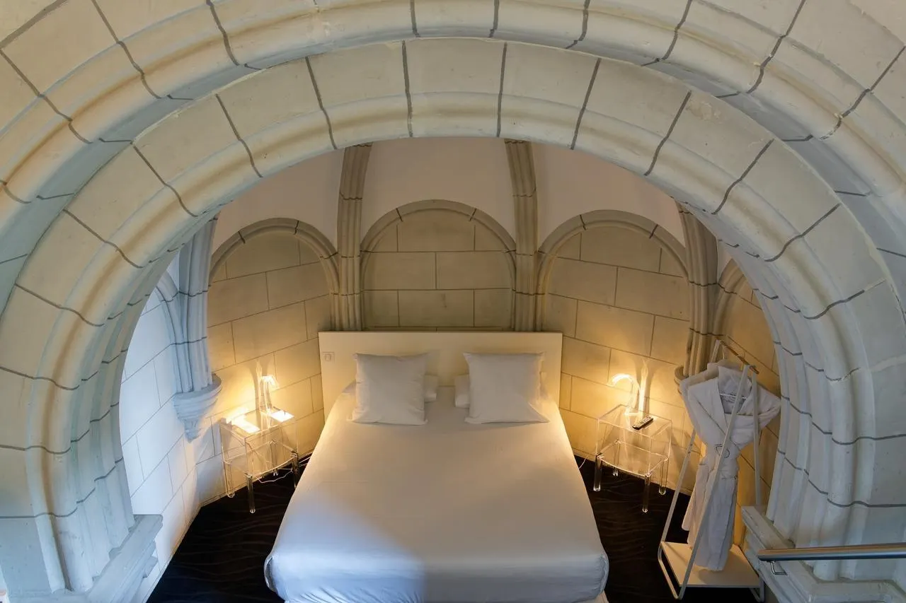 Dans la chambre séduction, le mobilier s’efface pour mettre en valeur l’architecture de l’absidiole. © Bertrand Bonenfant / Ouest-France