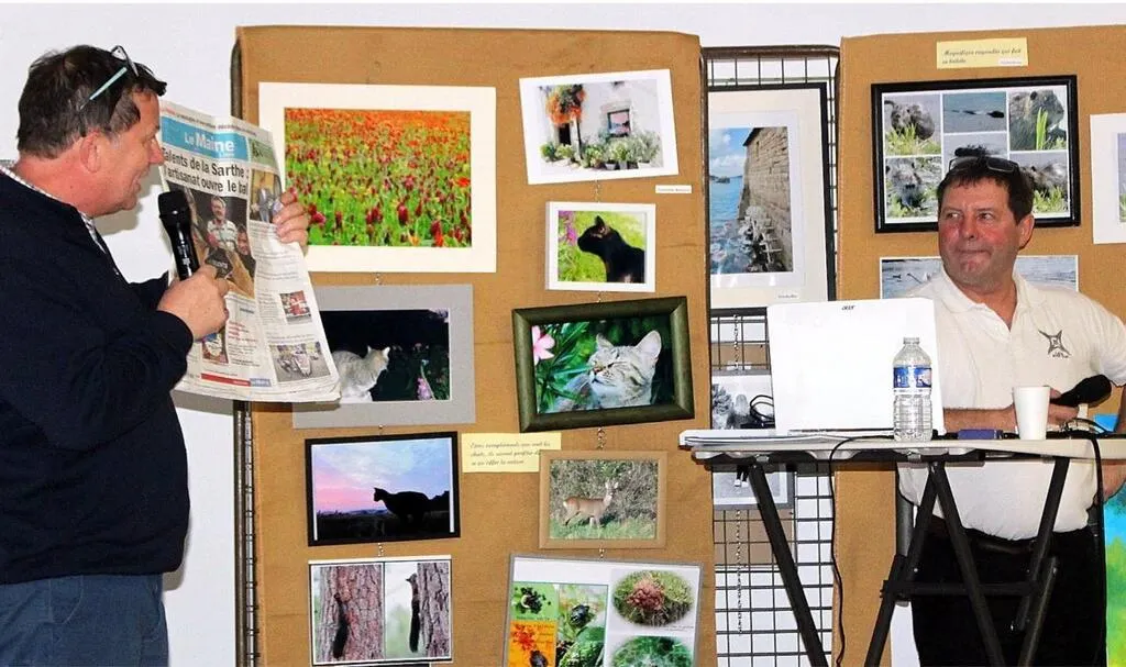 Christophe Naye, animateur de la soirée (à g.), soutient la candidature de Patrick Jouenne en tant que meilleur talent de la Sarthe, challenge organisé par Le Maine Libre. © Le Maine Libre