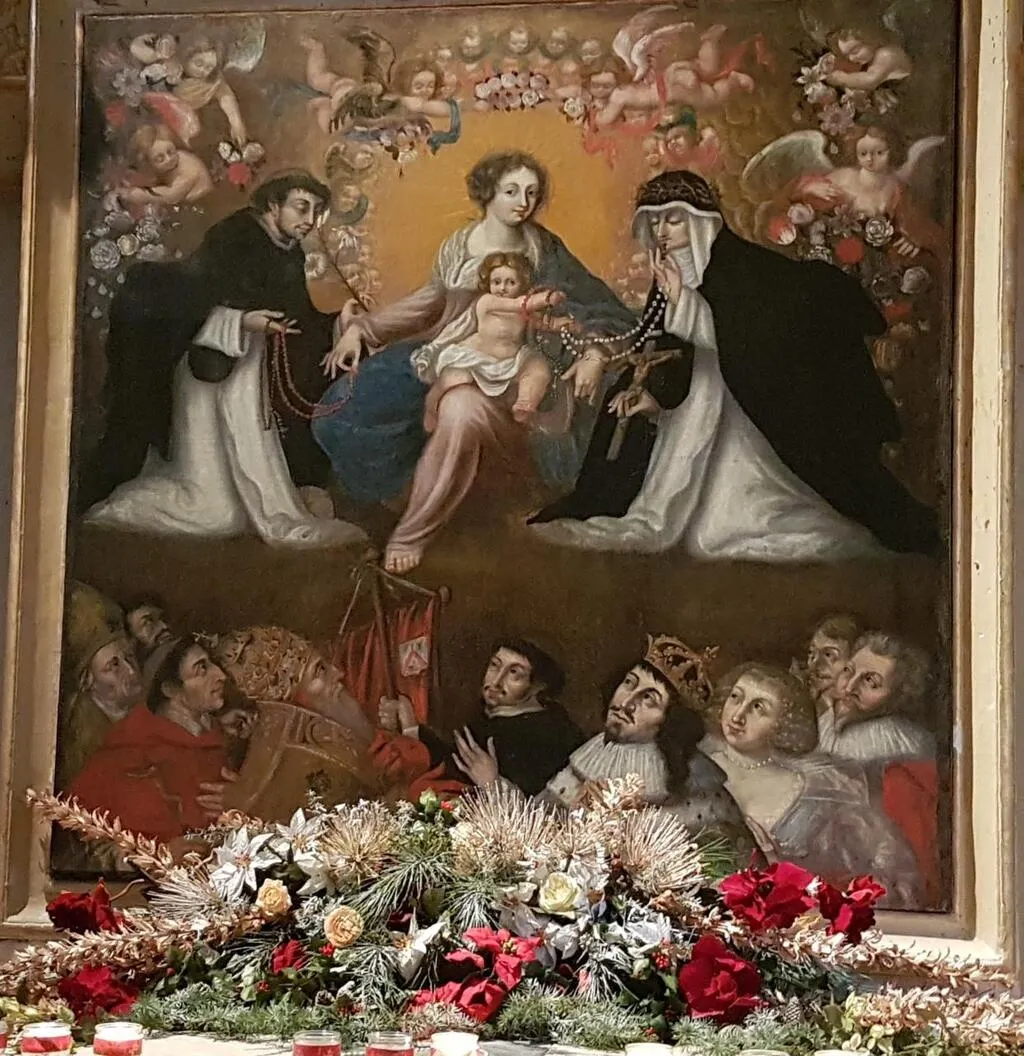 « La Vierge du Rosaire ». Le prêtre qui a commandé les deux toiles s’est fait représenter sur le tableau, brandissant un étendard. © Le Maine Libre