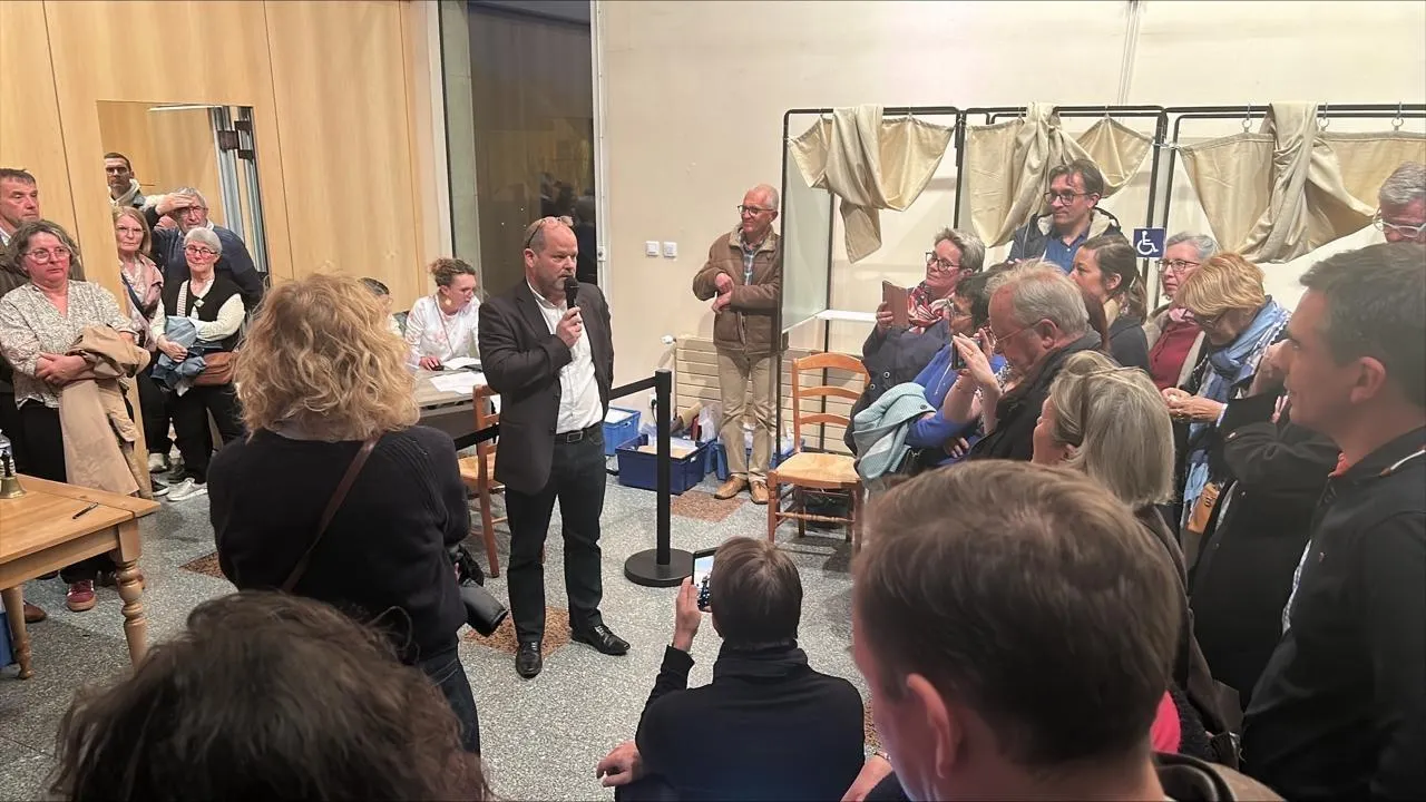 Mickaël Juigné, au micro, vainqueur des élections municipales 2026 à Yvré-l’Évêque (Sarthe), au second tour, dimanche 22 mars 2026. © Ouest-France