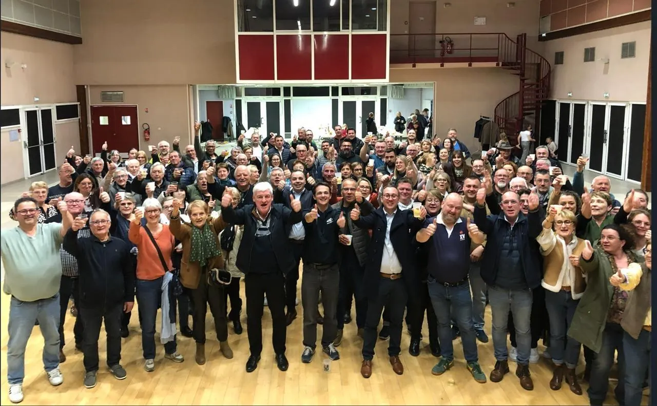 Champagné, dimanche 15 mars 2026. La victoire du maire (divers droite) sortant Patrick Desmazières, avec 55,34 des voix a été fêtée par son équipe. © Le Maine Libre