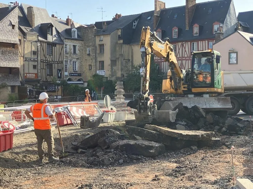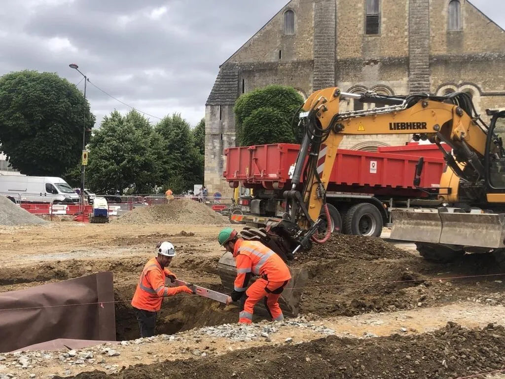 Place Washington, au Mans (Sarthe), une partie des travaux des Chronolignes est à l’arrêt en raison de la découverte d’ossements provenant d’un ancien cimetière. © Ouest-France