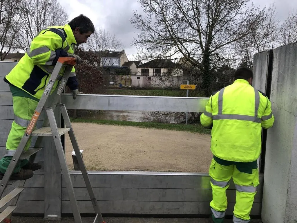 Régulièrement, des retenues d'eau provisoire, appelés batardeaux, sont installées pour éviter les crues, comme ici, au bout de la rue d'Australie, au Mans (Sarthe), en janvier 2024. © Archives Ouest-France