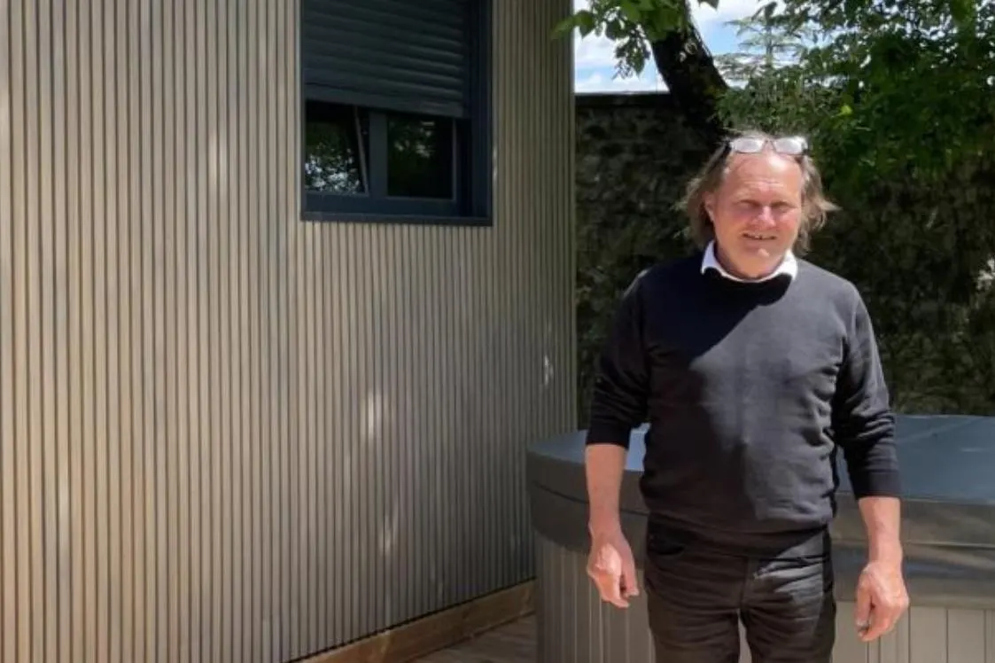 Roger Peslier en 2023, lors de la présentation de sa tiny house à l’hôtel Saint-Martin de Sablé. © Archives Le Maine Libre