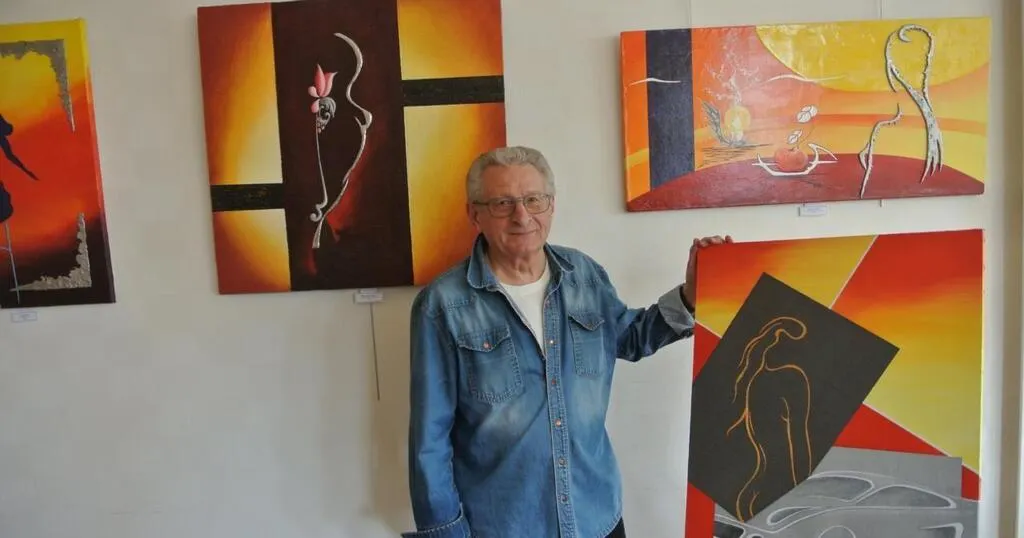 Bernard Marquis présente ses tableaux où les courbes sont très présentes, quelle que soit la matière. © Ouest-France