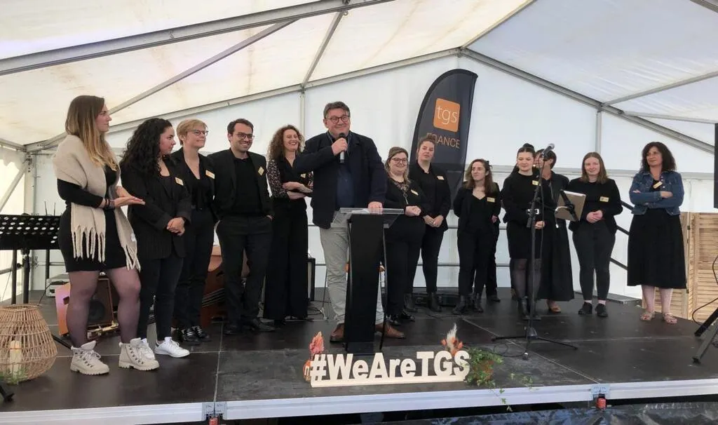 Philippe Besnier, directeur régional de TGS France au pupitre, avec à sa droite Agathe Kerguelen Directrice de l’Agence de Rouillon entourée de son équipe © ML
