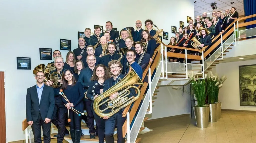Arnaud Martin (à gauche) avec les musiciens de l’Orchestre départemental d’harmonie de la Sarthe. © Ouest-France