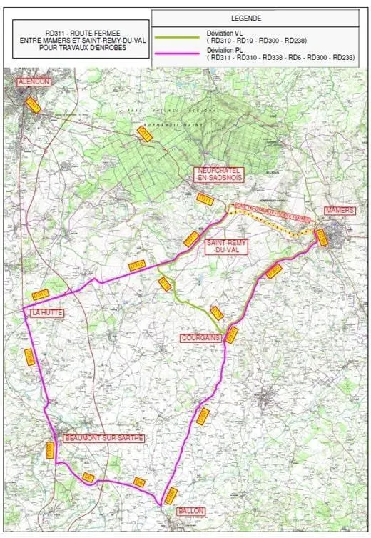 Deux déviations vont être mises en place une pour les véhicules légers (à partir du carrefour D310/ D311) et une autre pour les poids lourds depuis Alençon.