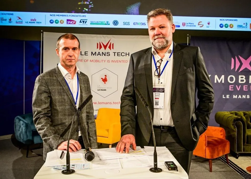 À l’occasion du salon X-Mobility, Philippe Barrière de l’entreprise Colas et Thomas Antoine du groupe Renault ont présenté le projet Apache, qui permettra d’identifier les routes bruyantes et de prévoir leur réfection avec un enrobé innovant. © Photo Le Maine Libre – Yvon LOUÉ