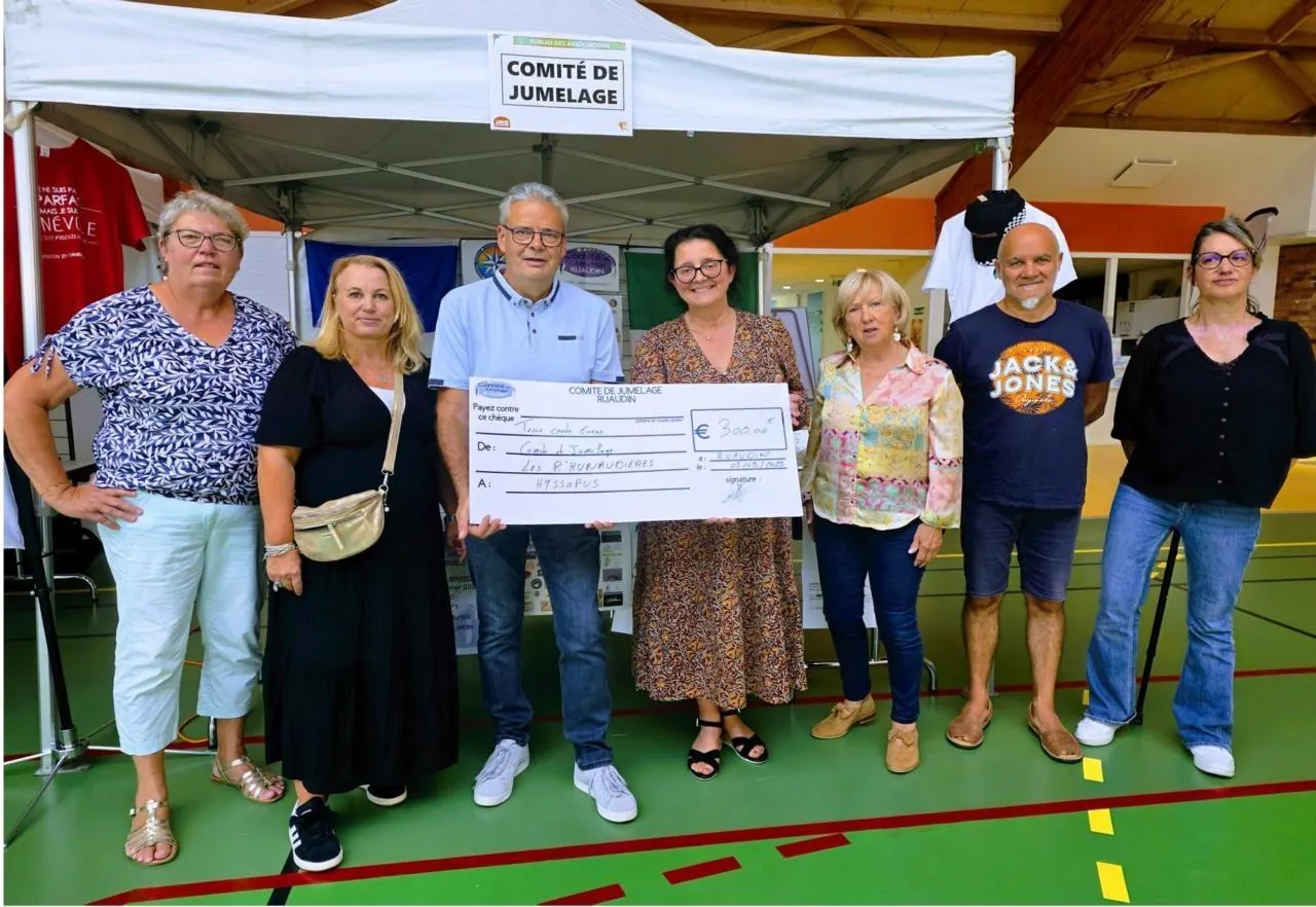 Lors du forum des associations, vendredi 5 septembre, le comité de jumelage a remis un chèque de 300 € au Dr Laurence Juhel Voog de l’association Hyssopus, spécialiste des maladies de la douleur. Lors des R’Hunaudières, une partie des recettes de la tombola lui a été reversée. © Ouest-France