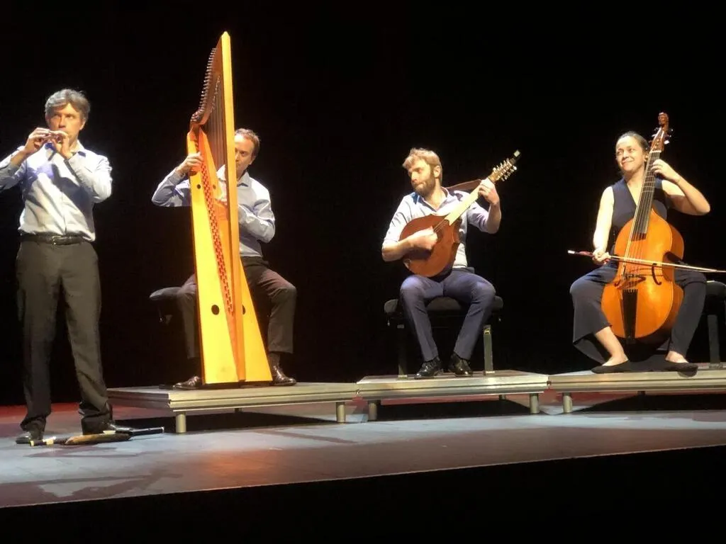 La formation The Curious Bards, avec ses musiques traditionnelles d’Écosse et d’Irlande, sur la scène Joël-Le Theule, à Sablé-sur-Sarthe, lors de l’édition 2024 de l’événement Ma région virtuose. © Archives Ouest-France