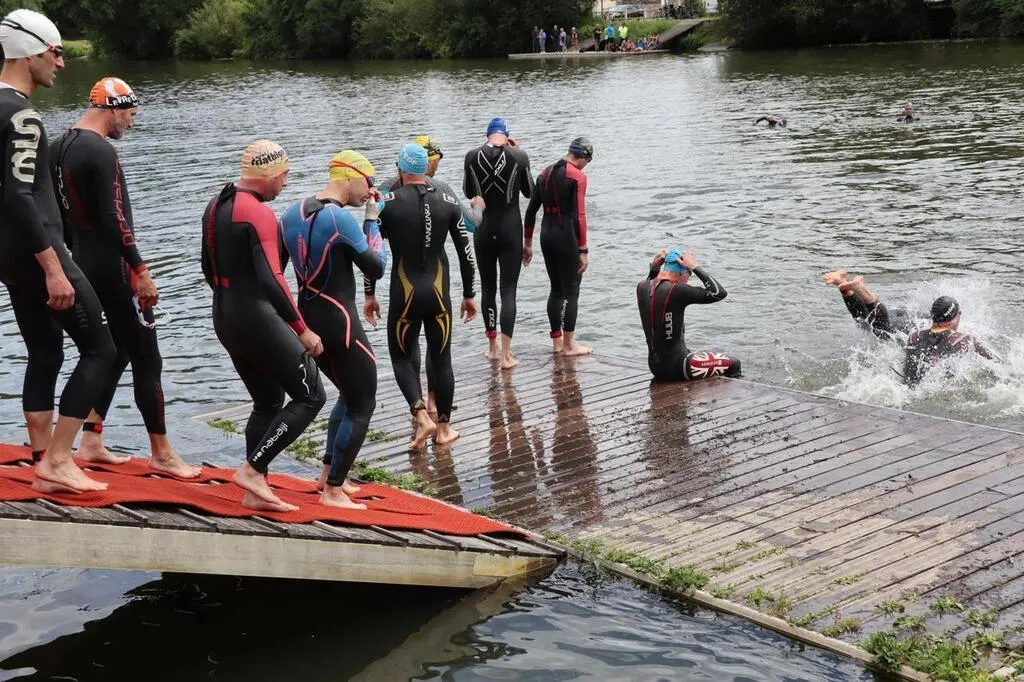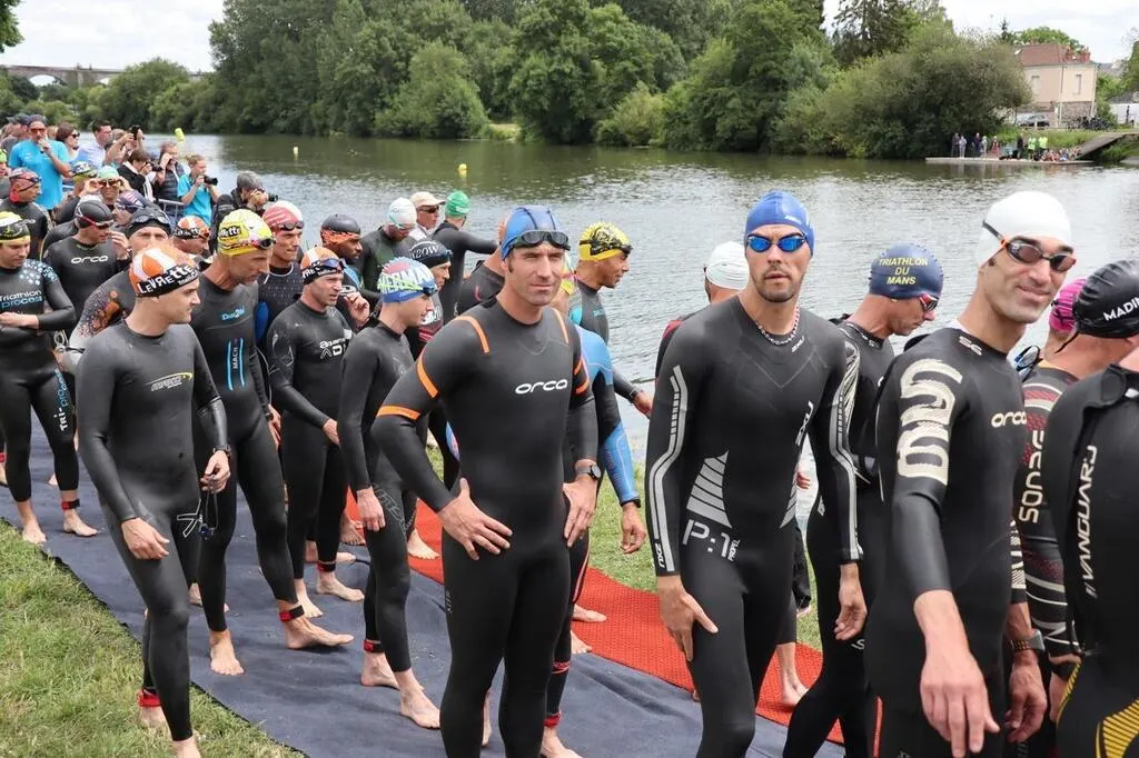 Une nuée de bonnets multicolores dans l’eau sombre de la Sarthe. Ce dimanche 26 juin 2022, un peu après 14 h, 87 triathlètes (dont 5 femmes) ont entamé l’épreuve de 1 500 m de nage, avant les 40 kilomètres à vélo et les 10 km de course à pied.