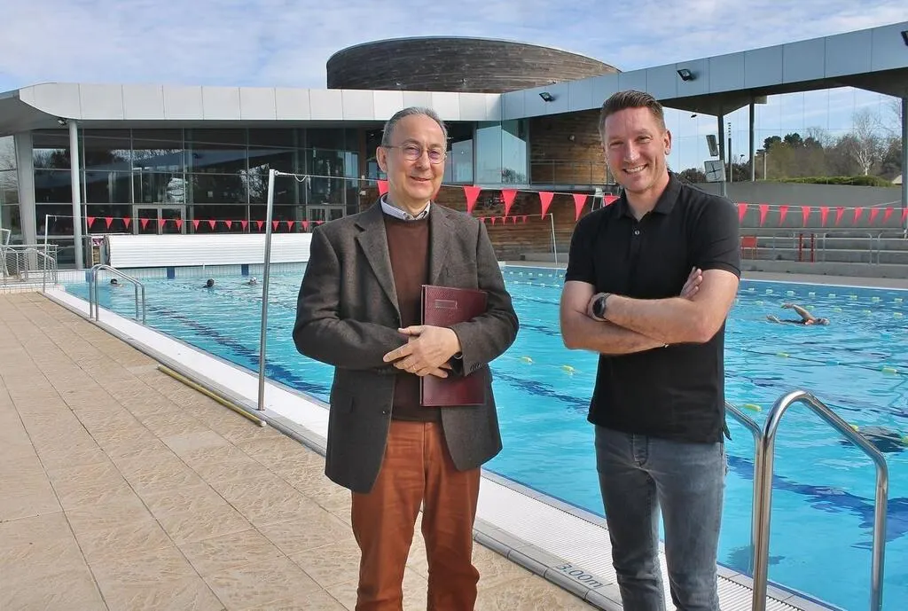 Claude Davy, vice-président de la communauté de communes du Pays sabolien en charge des sports, et Nicolas Leroy, directeur du centre aquatique, au bord du bassin extérieur, le 5 avril 2023. © Ouest-France