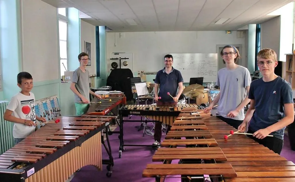 Des élèves de la classe de percussions du conservatoire du Pays sabolien autour de leur professeur Samuel Delafuys, avant leur concert qui aura lieu le mercredi 22 juin dans le cadre du festival À Corps et à cri à Sablé-sur-Sarthe. © Ouest-France