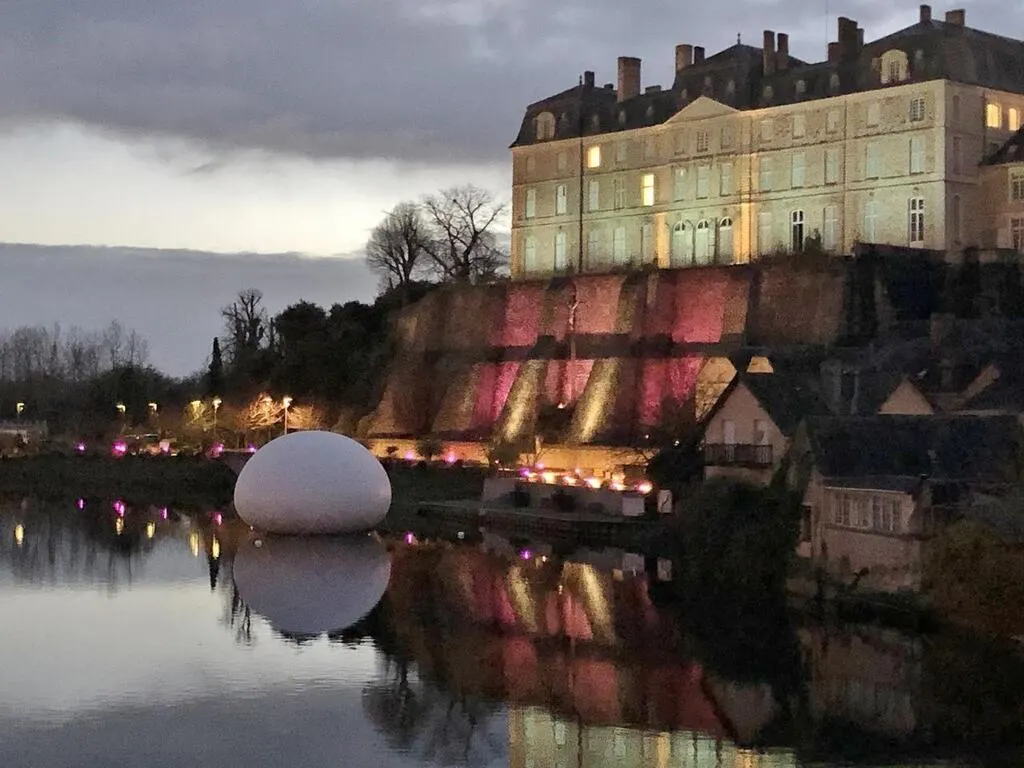 La bulle sur la Sarthe, face aux remparts du château, à la nuit tombante, mercredi 1er décembre 2021, à Sablé-sur-Sarthe (Sarthe). © Ouest-France