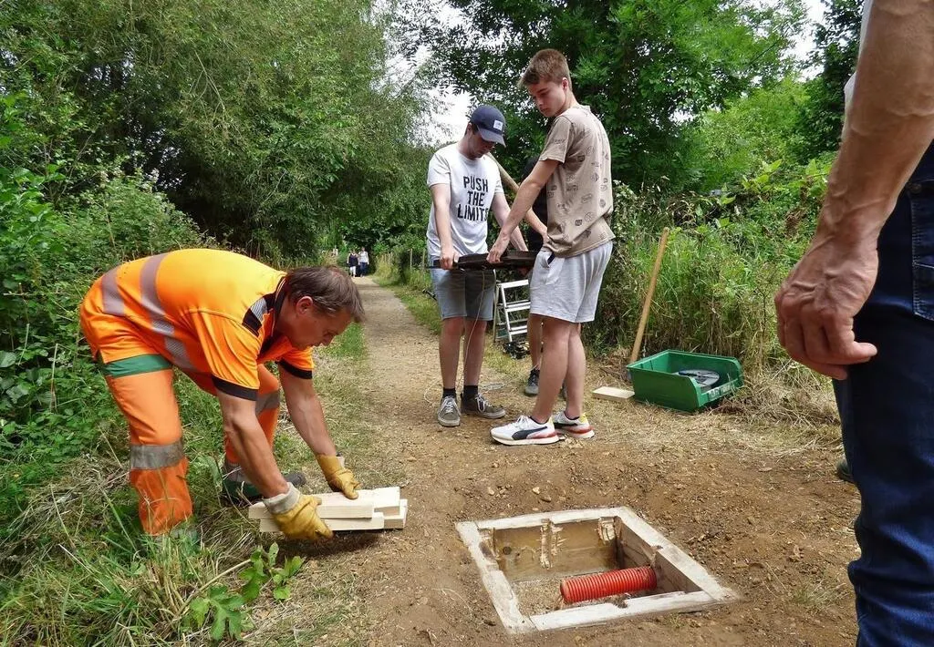 Des élèves en bac technologique au lycée Raphaël-Élizé de Sablé-sur-Sarthe ont mis au point un compteur pour connaître le nombre de passages sur les chemins de randonnées de la communauté de communes. Ils ont installé leur prototype jeudi 16 juin 2022, près de Cri-Cri place, à Solesmes.