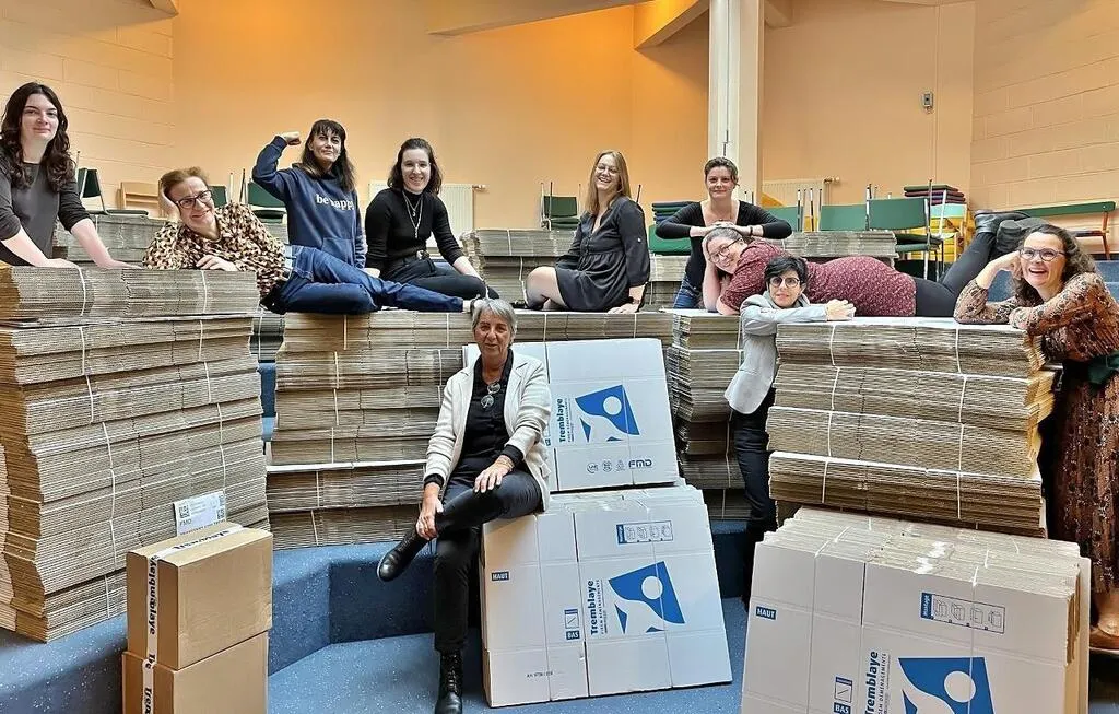 Une grande partie de l’équipe de la médiathèque, autour d’Yvette Marçais, la directrice (en bas, au centre), au milieu des cartons avant le déménagement. © Yvette Marçais