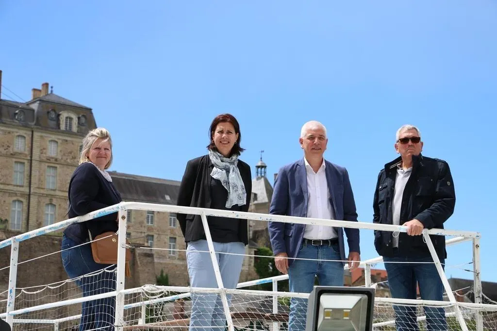 Geoffrey et Lucile Boureau (au centre) succèdent à Régis et Sandra Leroy à la barre du bateau restaurant le « Sablésien II ». © Ouest-France