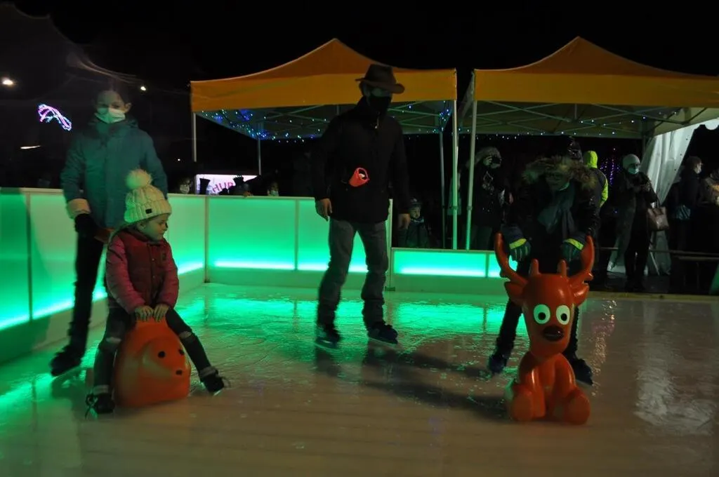 Nouveau, cette année : une patinoire est installée sur la place du Champ-de foire, jusqu’à dimanche soir. Le hic : il y avait beaucoup d’eau ce vendredi soir… Le maine libre