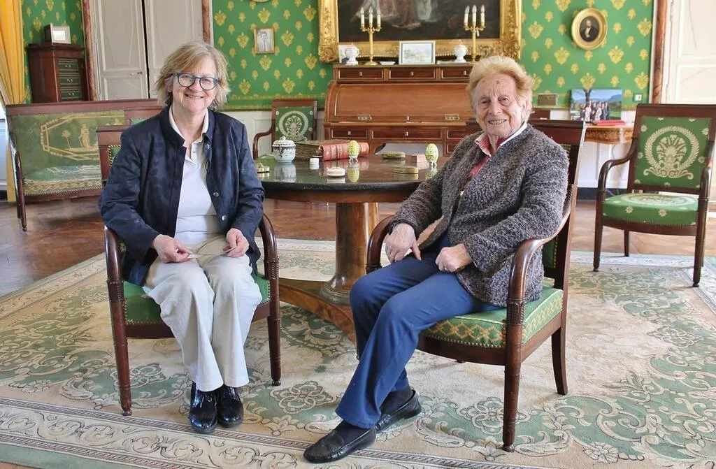Hélène du Peyroux (à droite), ici avec sa fille Nathalie Le Brethon, dans le grand salon du château de Dobert, à Avoise. © Archives Ouest-France