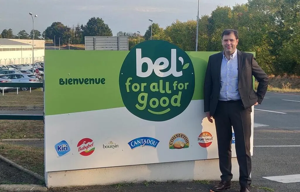 Vincent Gauteron, directeur du site sabolien de Bel, devant le panneau annonçant l’engagement du groupe dans son programme « Bel for all for good ». © Photo archives Fromagerie Bel