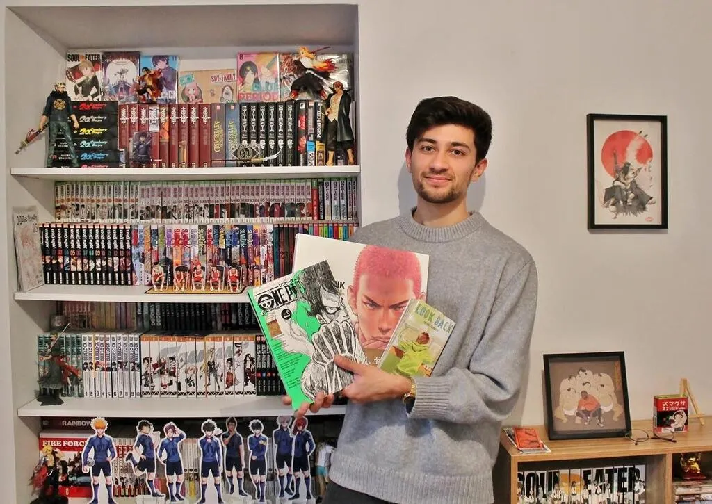 Lubin Latchoumaya, 26 ans, avec une partie de sa collection de mangas, chez lui, à Sablé-sur-Sarthe (Sarthe). © Ouest-France