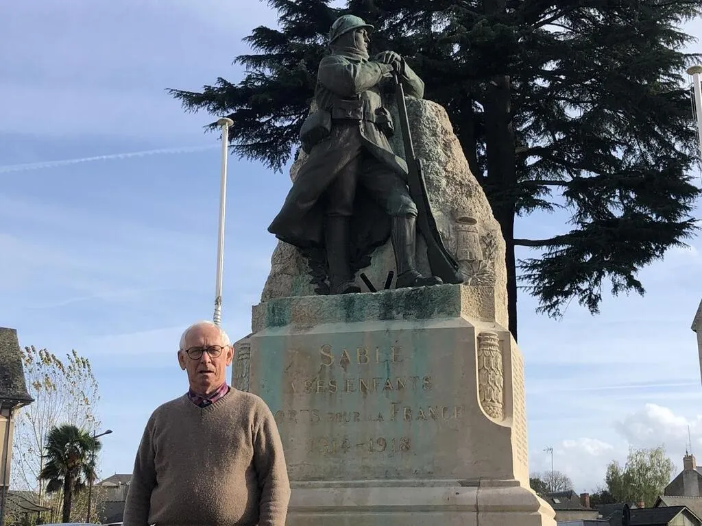 Jean-Claude Aubry, le président du Souvenir du bocage sabolien, devant le monument aux morts de Sablé-sur-Sarthe où sera célébrée la commémoration de l’armistice, vendredi 11 novembre 2022. © Ouest-France