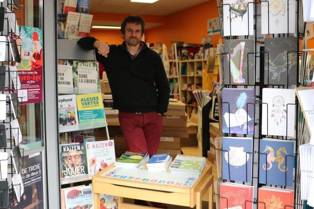 Seul libraire dans un rayon de quarante kilomètres autour de Sablé-sur-Sarthe, Nicolas de Laek n’a pas l’intention de baisser le rideau. Sans pouvoir accueillir ses clients dans sa boutique, il reste malgré tout ouvert, alors que la fin d’année est une période phare de son activité.