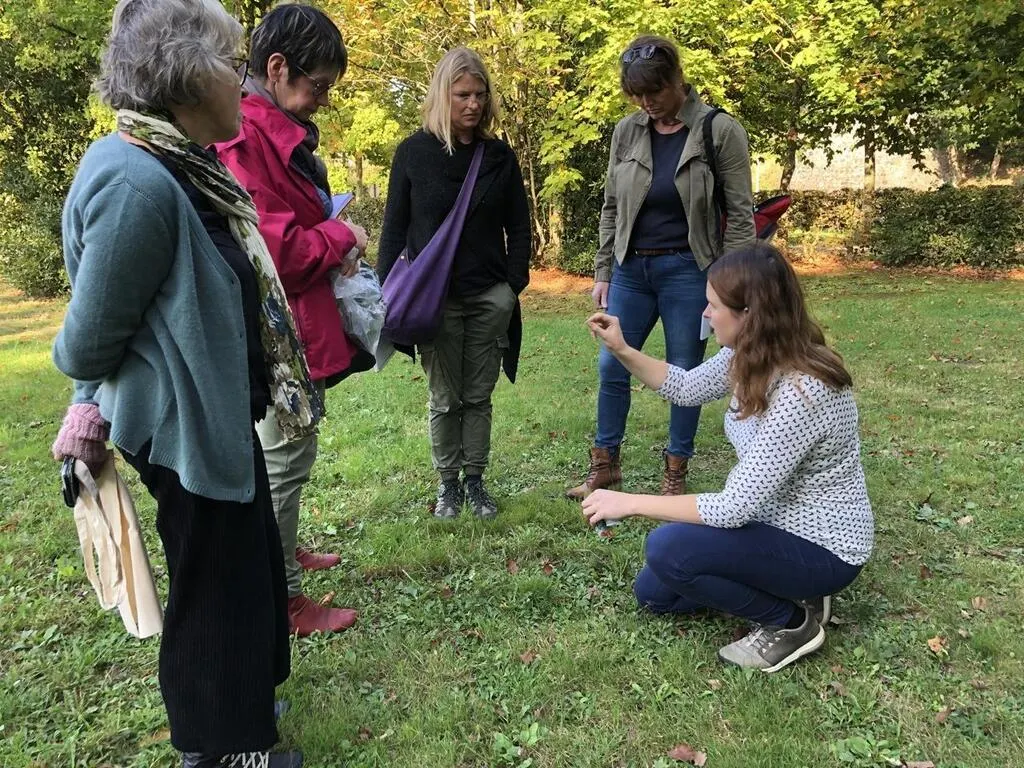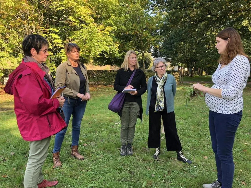 Stéphanie Bloc (à droite) apprécie de partager sa passion des plantes sur le terrain, comme ici dans le parc du château de Sablé-sur-Sarthe. © Ouest-France