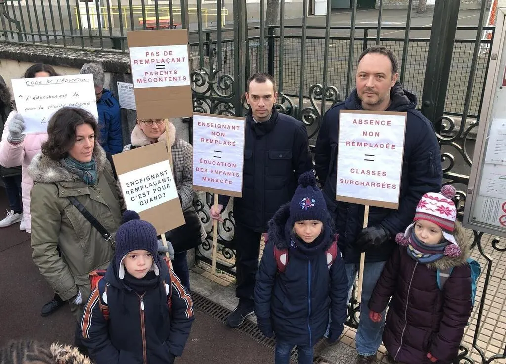 Plusieurs parents d’élèves munis de pancartes ont symboliquement bloqué l’entrée des enfants à l’école Gilles-Ménage pendant une dizaine de minutes, ce lundi 6 février 2023. Ils déplorent le remplacement défaillant de la professeure de CP-CE2, partie en congé maternité.