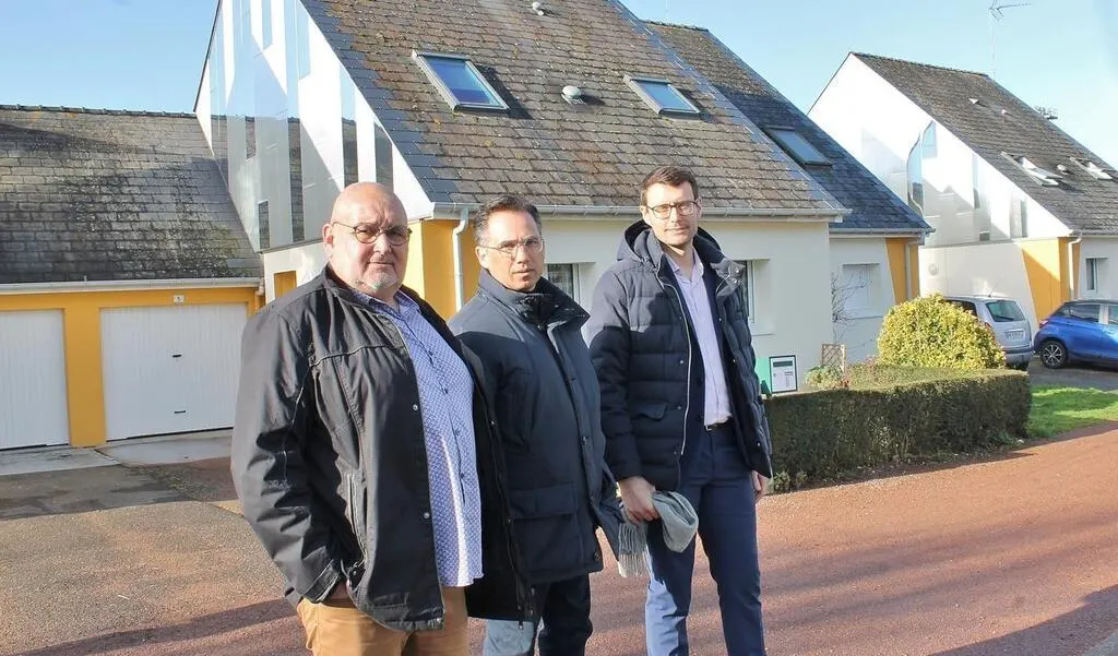 Jean-Pierre Ferrand, adjoint au bâti, Nicolas Leudière, le maire de Sablé-sur-Sarthe, et Arnaud Gere, responsable territorial maîtrise d’ouvrage chez Podeliha, ont visité le lotissement réhabilité dans le quartier du Pré, lundi 14 février 2022. © Ouest-France