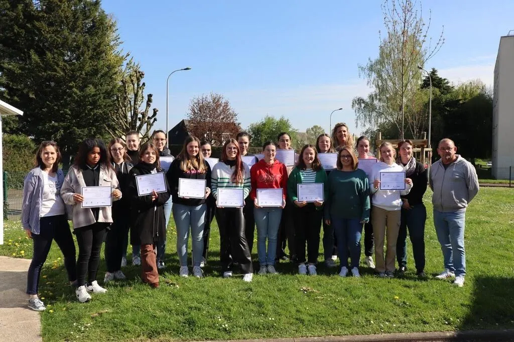 Entourés de leurs encadrants, les seize adolescentes formées ont posé avec leur diplôme, vendredi 21 avril 2023. © Ouest-France